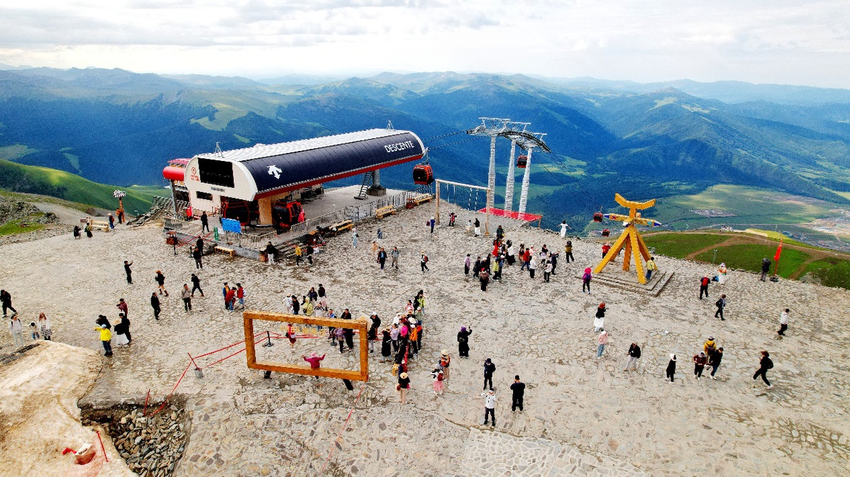 冬季的吉克普林国际滑雪场是雪友们的“心头好”,夏季的云霄峰也依然是游客们喜爱的游玩地。坐上缆车,登上海拔2848米的峰顶处,这里可以“一览众山小”,可以用手机找到无人机才能观察到的绝美视角。红隼在天空中盘旋,远山如黛、生机盎然,参访团被这方广阔的天地深深吸引。