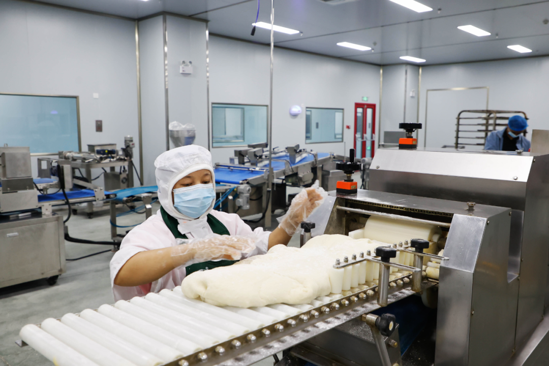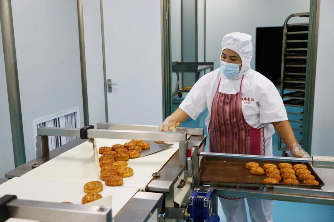在新疆晟麦食品有限公司生产车间,流水线不停运转,通过完成面团定型、烘烤冷却、包装封箱等工序,一块块月饼发往各地门店,为中秋、国庆双节中团圆的家庭带来幸福香甜。