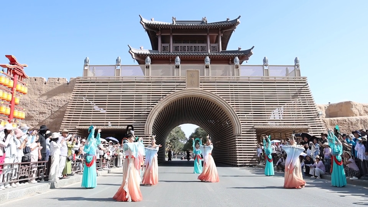 8月4日上午11时,库车市热斯坦街道城门楼前聚满等待观礼的游客。随着号角声起,戍边将士推开城门,鼓乐齐鸣中,龟兹王、班超等历史人物登场,配合旁白讲述库车作为古龟兹都城和丝路枢纽的过往,重现多元文化交融、戍边情怀等历史场景。游客沉浸其中,纷纷拍照记录。