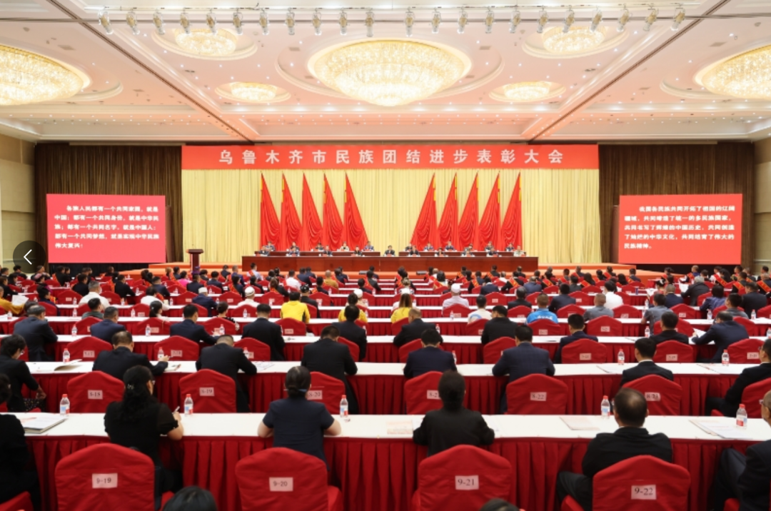 8月22日,乌鲁木齐市民族团结进步表彰大会召开。自治区党委副书记、市委书记张柱出席会议并讲话。图为:会议现场。记者陈星宇摄