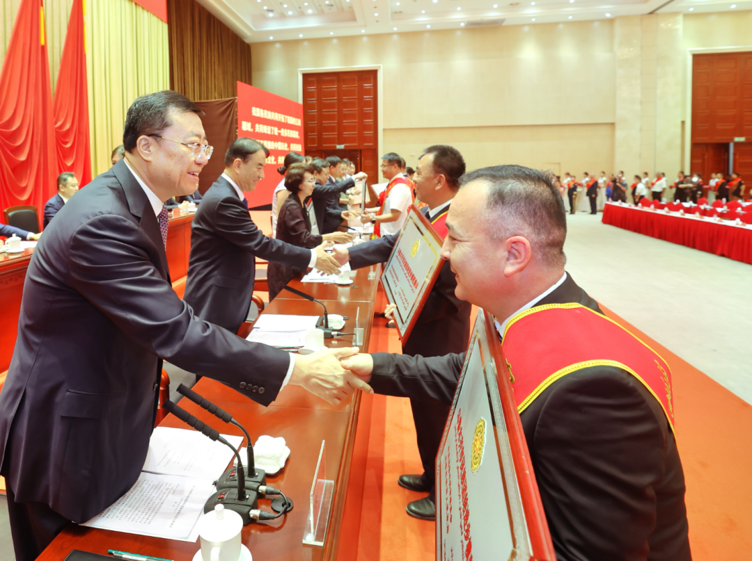 8月22日,乌鲁木齐市民族团结进步表彰大会召开。自治区党委副书记、市委书记张柱出席会议并讲话。图为:张柱为受表彰的模范集体和模范个人代表颁奖。记者陈星宇摄