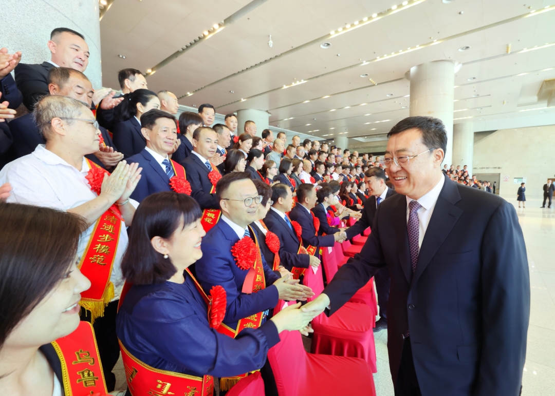 8月22日,乌鲁木齐市民族团结进步表彰大会召开。自治区党委副书记、市委书记张柱出席会议并讲话。图为:会前,张柱与受表彰的模范集体和模范个人代表握手并合影留念。记者陈星宇摄