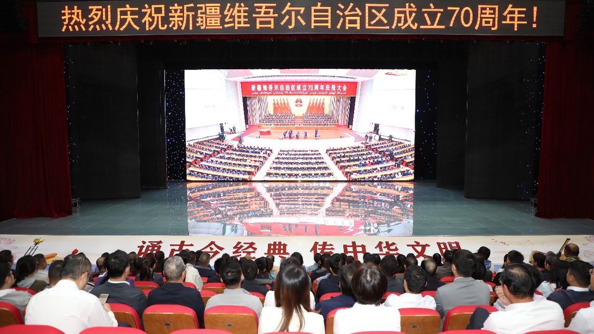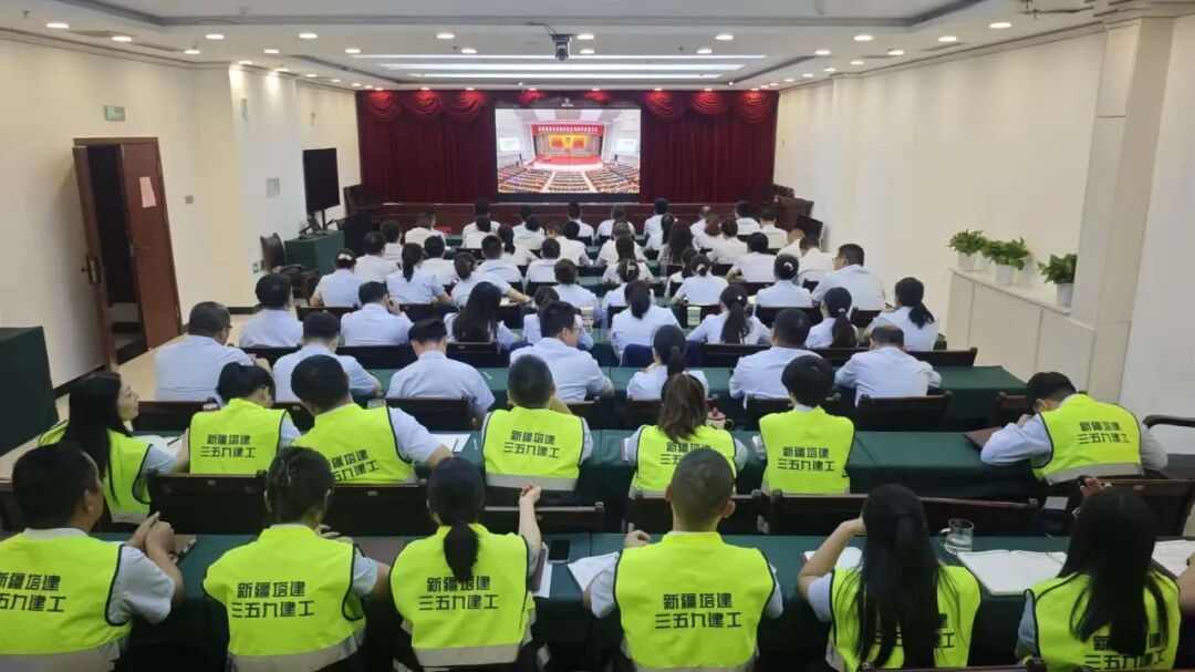 新疆塔建三五九建工有限责任公司组织员工收看新疆维吾尔自治区成立70周年庆祝大会直播。王芳芳 摄