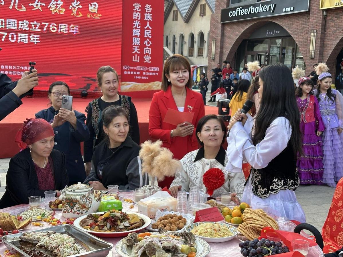 秋日的新疆阿尔泰山麓层林尽染,克兰河畔炊烟袅袅。9月29日,在中华人民共和国76周年华诞之际与新疆维吾尔自治区成立70周年的历史性时刻,阿勒泰市五百里风情街上,一场以“党旗映金山 铸牢聚民心”为主题的百家宴融情活动,将雪都的团结奋进篇章书写得格外炽热。300名来自全市各行业的模范代表、各界群众围坐30张圆桌,以美食为媒、以榜样为灯,在《没有共产党就没有新中国》的嘹亮歌声中,共同奏响“铸牢中华民族共同体意识”的时代交响曲。