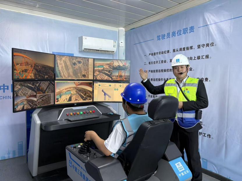 在智能建造展示区,一系列“黑科技”的应用让人目不暇接,真切感受到未来工地的模样。5g无人塔机操控系统无疑是现场的“明星”。操作室内,塔吊司机不再是身处数十米高空,而是舒适地坐在室内,通过6块高清屏幕对塔机进行360°无盲区的远程精准操控。这得益于5g网络“毫秒级”的低延时通信保障和多视角高清摄像头的全面覆盖,真正实现了“将高空作业地面化”。配合远程控制系统与实时监测平台,操作员能精准掌握塔机垂直度、实时风速、起重量等关键数据,不仅大幅提升了吊装作业的安全性与效率,也彻底改善了司机的作业环境。项目机电工长任天照介绍时难掩自豪:“这不仅是技术的升级,更是对劳动者关怀的体现。”